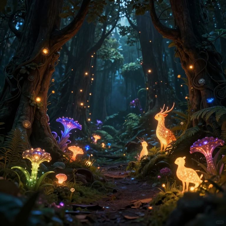 Enchanted forest at night, illuminated by glowing mushrooms, fireflies, and luminous deer, creating a magical, vibrant, and whimsical scene
