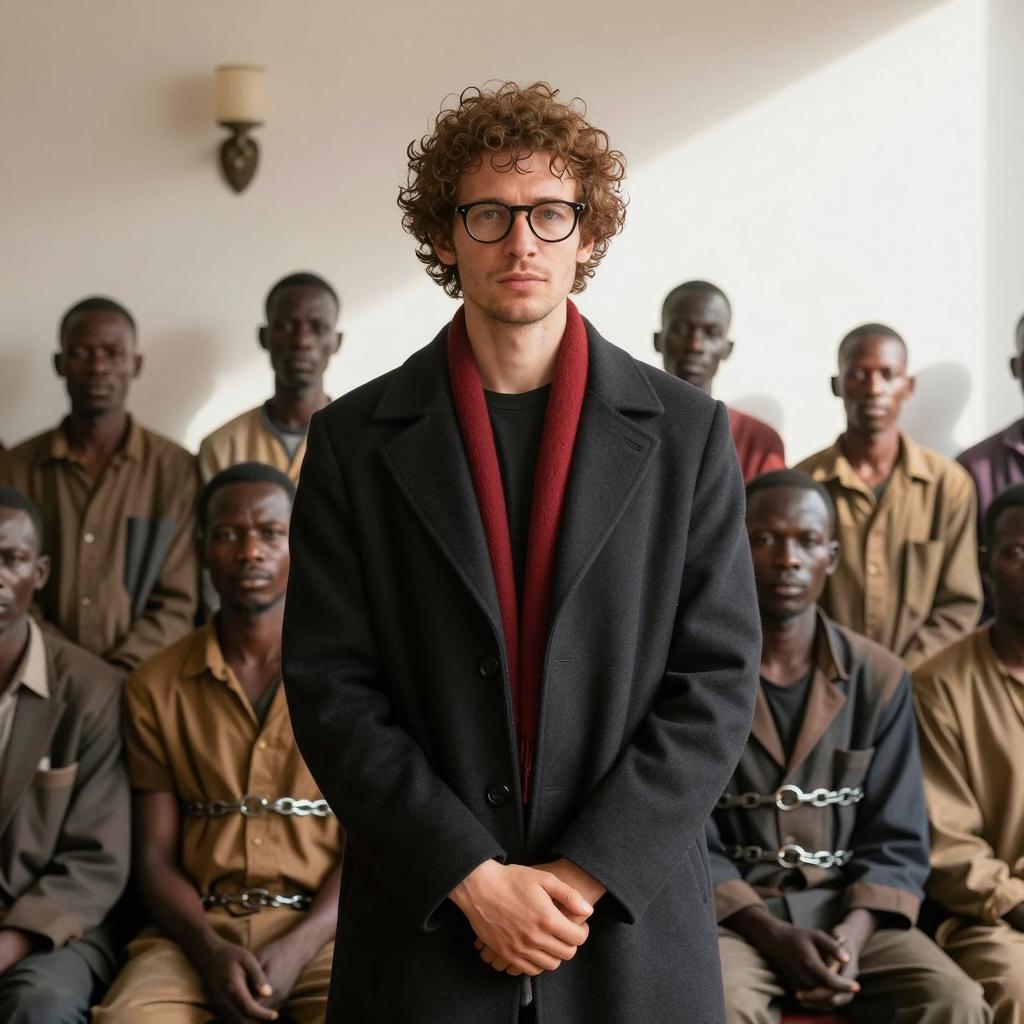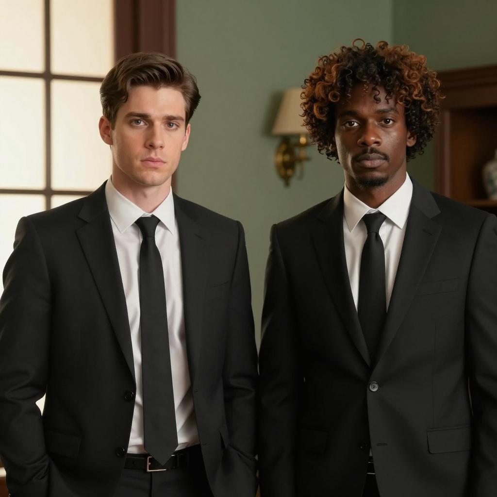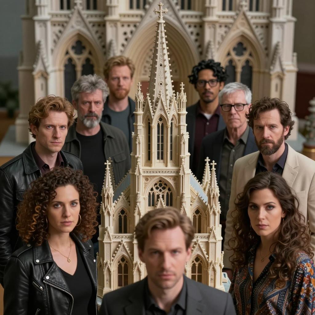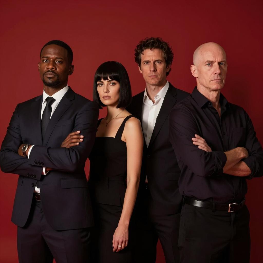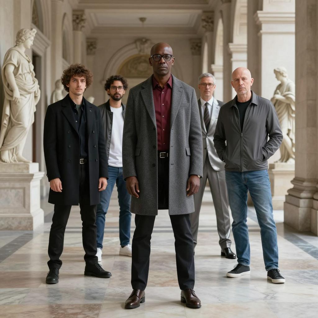 Five men in a grand, stone-walled hallway with classical sculptures. Central black man in gray overcoat, red shirt, glasses, bald, serious expression. Left man in black coat, curly hair, neutral expression. Middle man in white shirt, gray jacket, casual stance. Right man in gray jacket, blue jeans, relaxed pose. Background man in metallic suit, standing. Marble floor, detailed stone columns, statues.