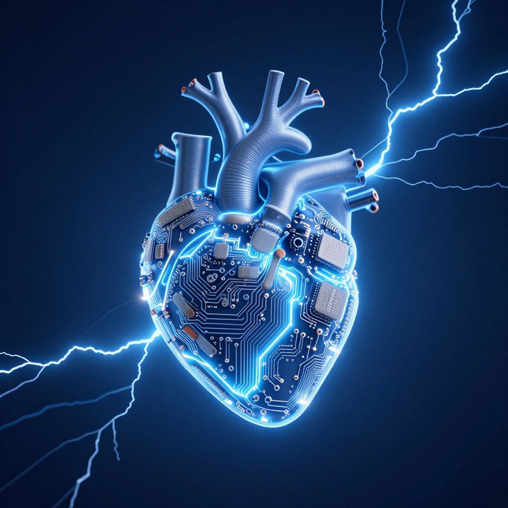 School Life a human heart made of circuit board with a navy blue background, an electric glow around it as if struck by lightning,