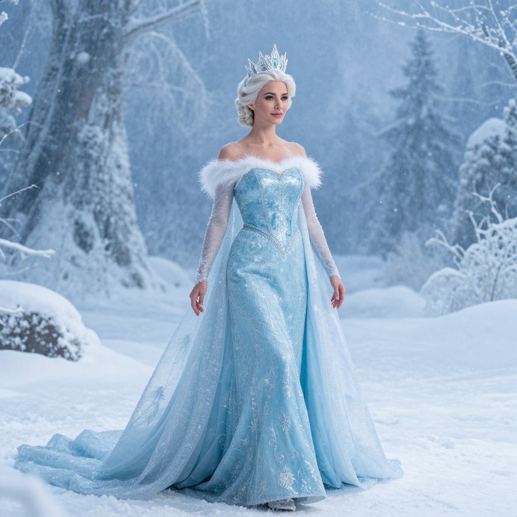 In a breathtaking display of fantasy, a woman dressed as a snow queen emerges from a mystical snowy landscape, embodying grace and power. Her flowing blue gown and intricate crown evoke a sense of enchantment reminiscent of classic fairy tales. This captivating imagery captures the essence of winter magic and royalty.