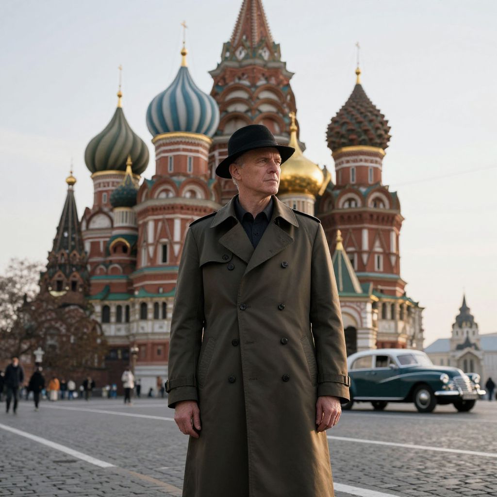 A futuristic cityscape with a man in a trench coat and hat standing in front of a cathedral with golden domes, reminiscent of Red Square, with a vintage car in the background.