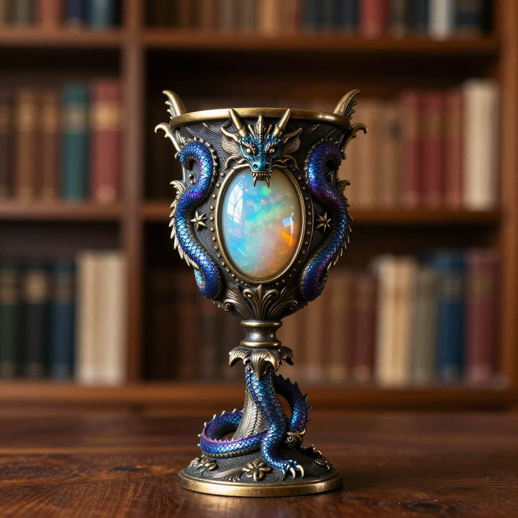 Fantasy style fantasy style, blue and purple dragon (chalice|goblet), dragon ornaments, bronze ornament, photograhpic, realistic, cozy livingroom, bookshelf, bokeh, highly detailed, absurdres details, ral-opal