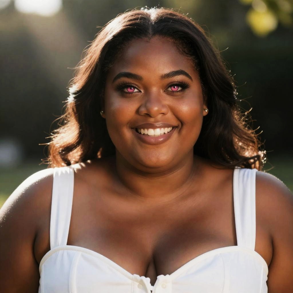 A mature fat Barbadian woman, chiseled facial features with tanned skin, warm pink eyes with thick eyebrows, a full nose and defined cheekbones, full lips and weak jawline, with glowing pupils and ecstatic expression, wearing open white corset outfit, depth of field, god rays, vivid colors, cinematic hard lighting, smooth shadows