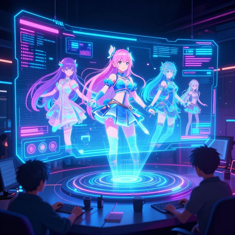 Anime generator concept art, futuristic digital interface with vibrant neon colors, holographic anime characters being created in a high-tech studio, dynamic lighting and cyberpunk aesthetic, ultra-detailed, immersive scene