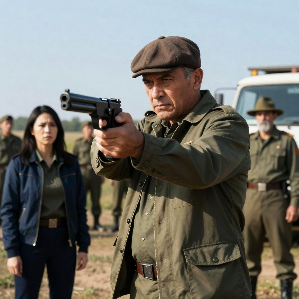 A middle-aged man with a brown flat cap and green jacket aims a gun forward. He has a serious expression. In the background, a woman with long black hair in a blue jacket and dark pants stands to the left, looking concerned. Several men in green uniforms stand in a field. An older man with a gray beard and hat stands near a white truck on the right. The scene is outdoors with a clear blue sky.