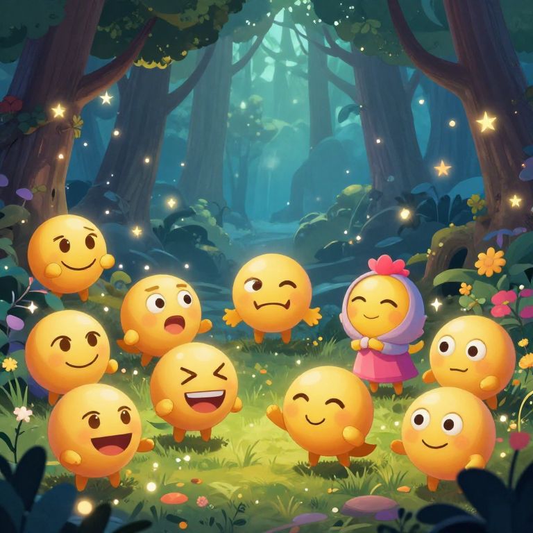 Emoji edit portraying a fantasy scene where emojis come alive as little creatures with unique personalities, set in a magical forest with twinkling lights and vivid colors, imaginative and detailed illustration