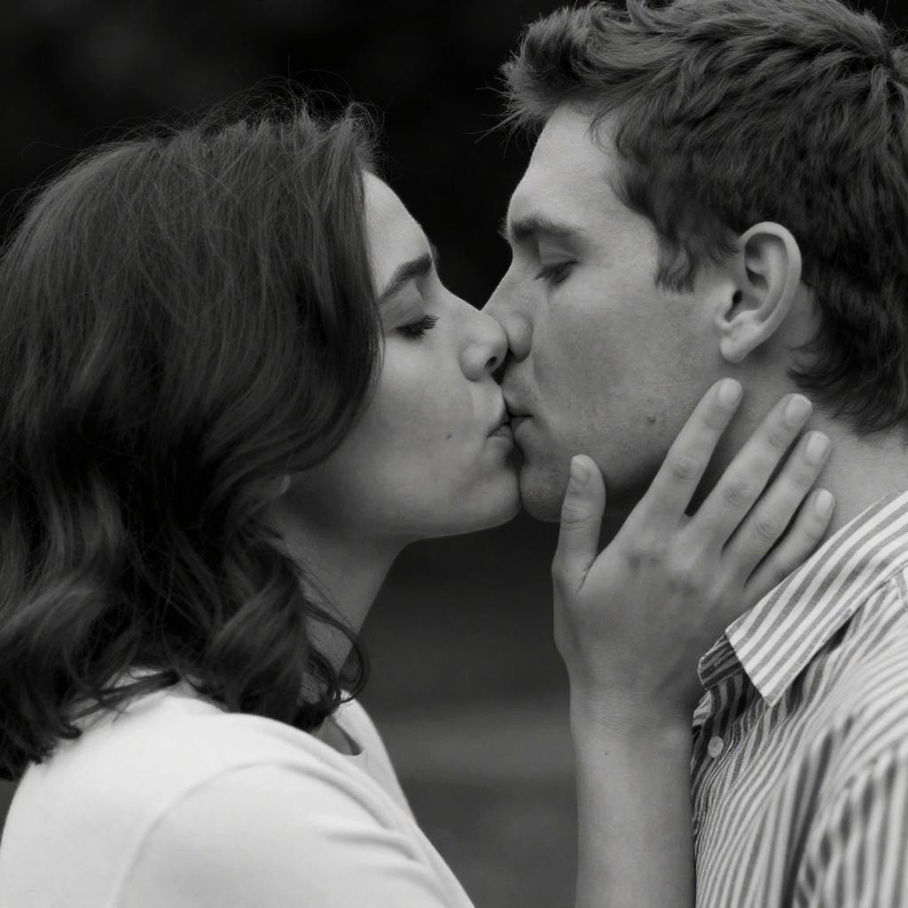 Sepia-toned photograph of a man and woman kissing. Man with dark hair, mustache, and scarf, wears dark jacket. Woman with short curly hair, patterned top, hand on man's chest, rings on fingers. Both eyes closed, intimate moment.