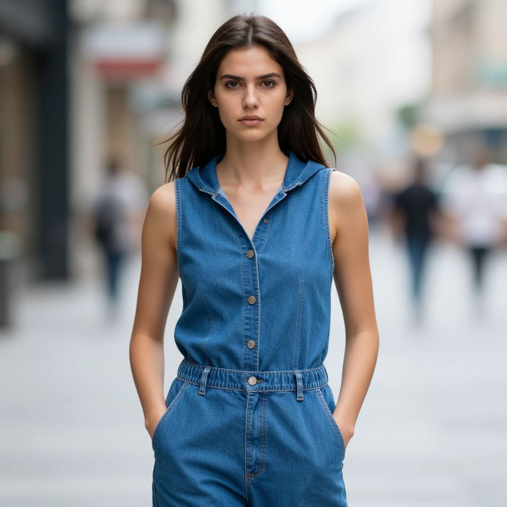 Photograph of a young woman with long dark brown hair and fair skin, standing in a blurred urban street. She's wearing a sleeveless, button-up blue denim hooded jumpsuit with pockets and hands in her pockets. Her expression is serious, and the background is out of focus with hints of buildings and people. The lighting is bright, highlighting her features.