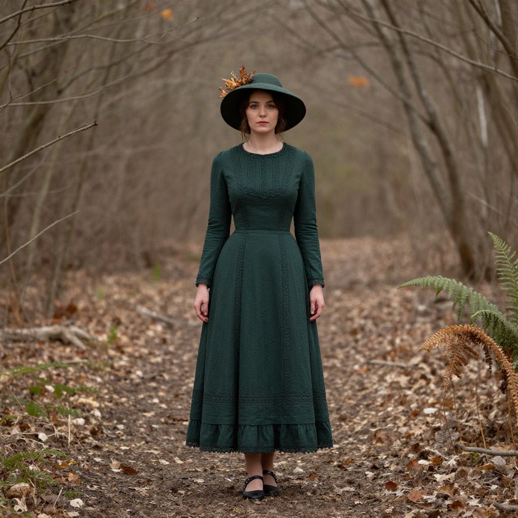 Portrait of a woman wearing a dark green, long-sleeve vintage dress with lace trim and an A-line silhouette, standing on a forest path covered with leaves. She is also wearing a matching wide-brimmed hat adorned with foliage. The setting is a muted, autumnal woodland with bare trees and ferns.