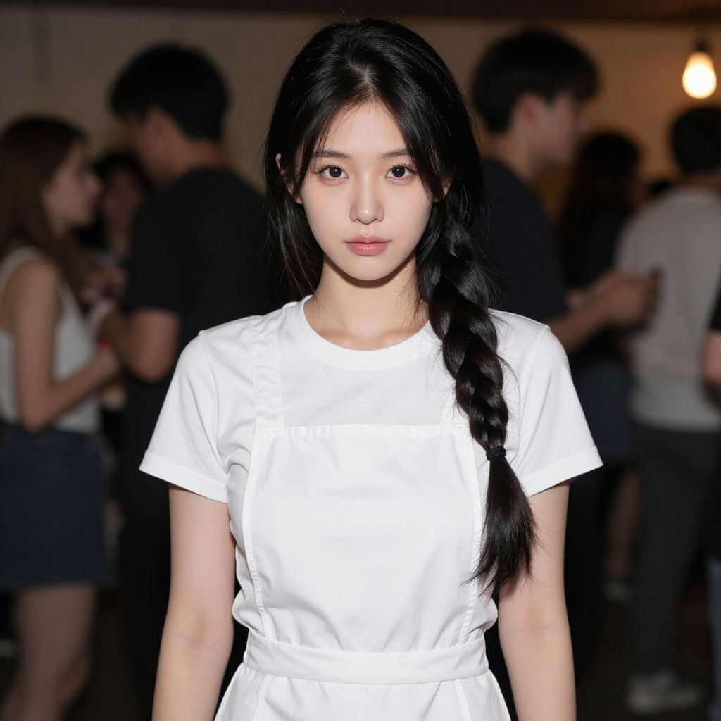 "costume parties, solo, 1girl, braid, apron, realistic, looking at viewer, black hair, blurry, blurry background, short sleeves, arms at sides, cowboy shot, closed mouth, single braid Realistic photo of casual sexy person with pretty face"