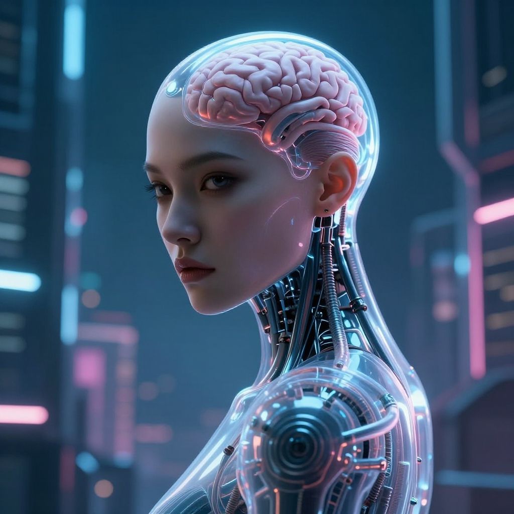 CGI image of a futuristic female android with a transparent head revealing her brain, glowing neon cityscape background, sleek metallic body.