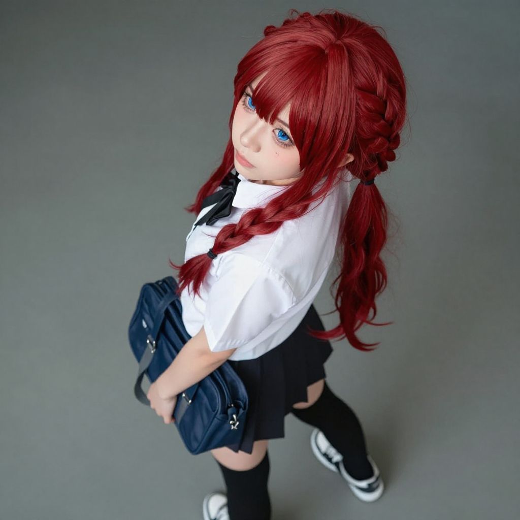 1girl, teen, flat chest, sky blue eyes, - vermilion hair, long hair, braided ponytail, shot hair, wavy hair, bangs, embarrassed, head_tilt standing, POV, serafuku, black bow, thighhighs, sneakers, navy school bag, hip focus, Looking back, Wormfs Eye View, looking down, contrapposto, dynamic pose, cinematic lighting