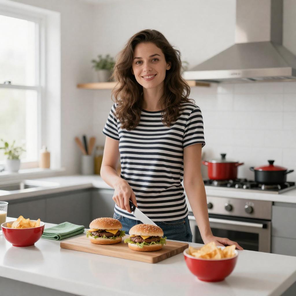 Woman with long brown hair, wearing black and white striped shirt, smiling, holding knife, standing in modern kitchen. Counter with burgers, chips, red bowls, green cloth, red and black pots, silver range hood. Bright daylight through window.