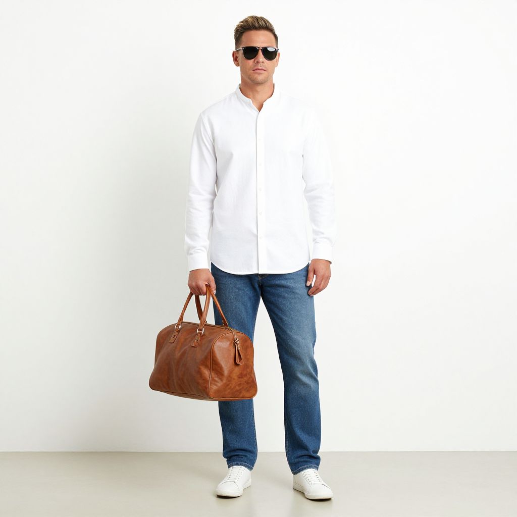A photograph of a casually dressed man standing against a plain white background. He wears a white long-sleeve shirt, blue jeans, and white sneakers. He's holding a brown leather duffel bag in his right hand and has sunglasses on. His hair is short and dark blonde. The floor is a light grey, adding a subtle contrast to the image.