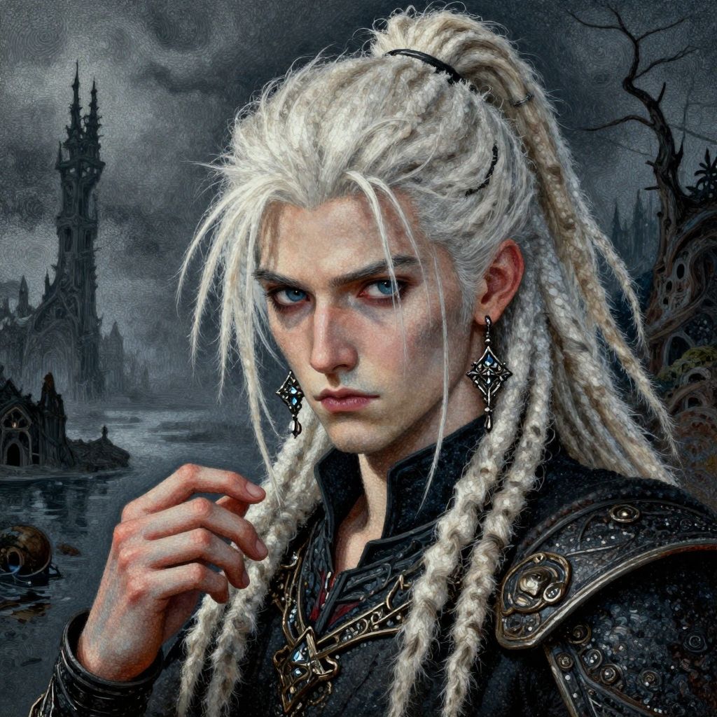 Digital fantasy artwork of a white-haired, pale-skinned, blue-eyed male warrior with dreadlocks, wearing dark armor, dramatic earrings, and intense gaze