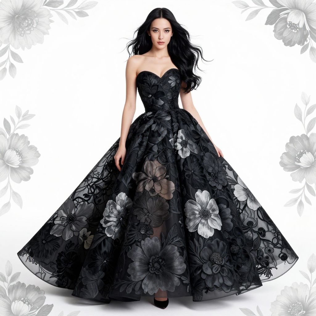 Photograph of a woman with long, wavy black hair wearing a strapless, black, floor-length gown with a fitted bodice and a full, floral-patterned skirt. The gown features large, detailed black and white floral designs, giving a textured, almost three-dimensional appearance. She stands against a white background with a gray floral border, her posture straight and confident. The dress contrasts sharply with her fair skin, and she wears black high heels, completing the elegant look. The lighting is bright and even, highlighting the intricate details of the gown.