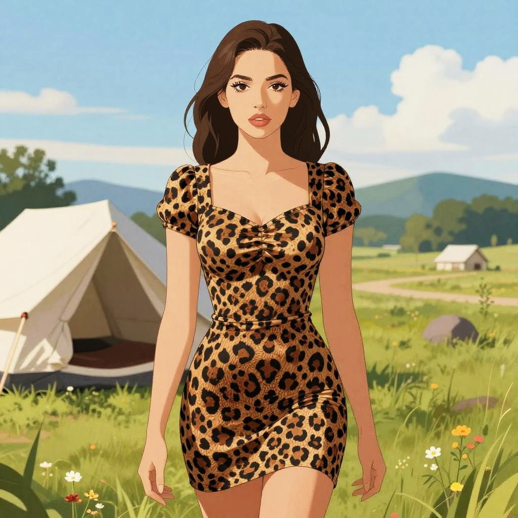 A Slim woman in a body-conscious leopard print mini dress with short puff sleeves, standing in a meadow with a tent, illustrated in the style of IDW Publishing. Sexy. Pretty face and beutiful eyes
