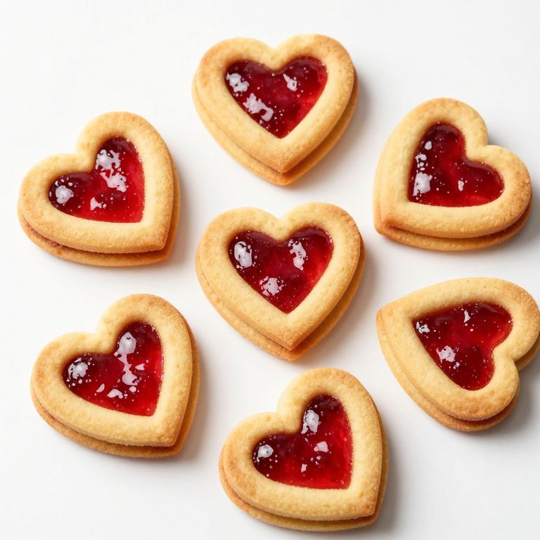 Six golden Linzer cookie hearts, each filled with vibrant raspberry jam, are artfully arranged on a pristine white surface, showcasing their delicate texture and glossy filling.