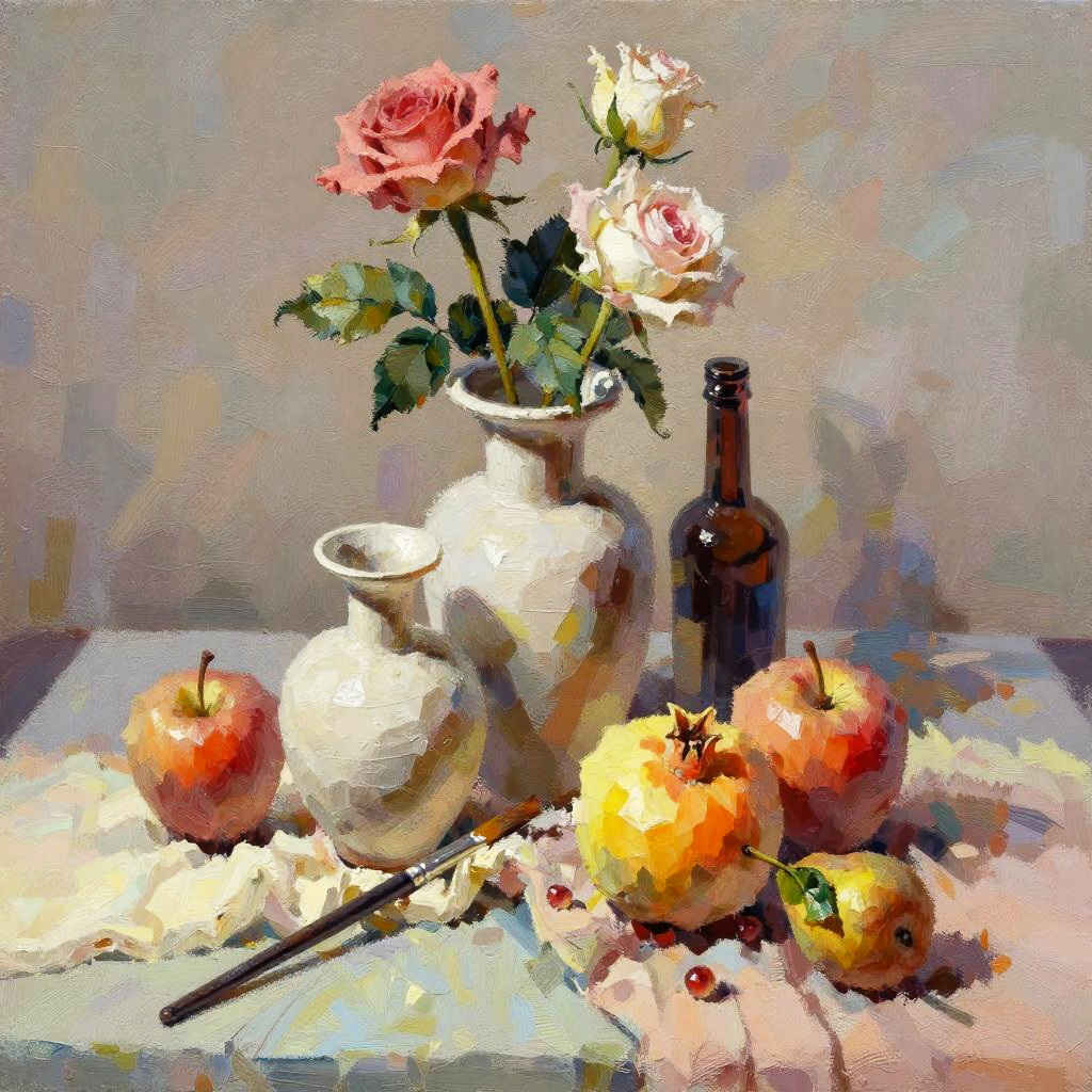 Cubist style painting, studio table with scattered paintbrushes, still-life featuring three white vases of varied shapes and a small brown bottle with a dark top; pink roses and white flowers with lively green leaves; fruits arranged around them: a red apple, a yellow-orange pomegranate, another red apple, and a small brown pear with a green leaf; cool ambient light; realistic textures, crisp edges, gentle reflections, soft falloff, color-true, editorial quality