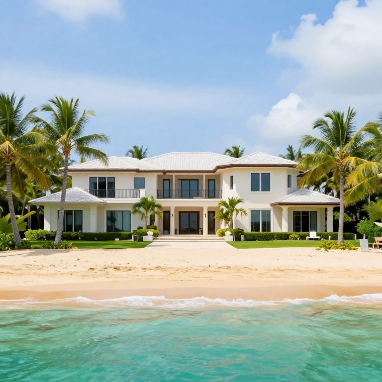 A luxurious waterfront mansion with light yellow sand, green palm trees, and light blue sky, overlooking light emerald green ocean water.