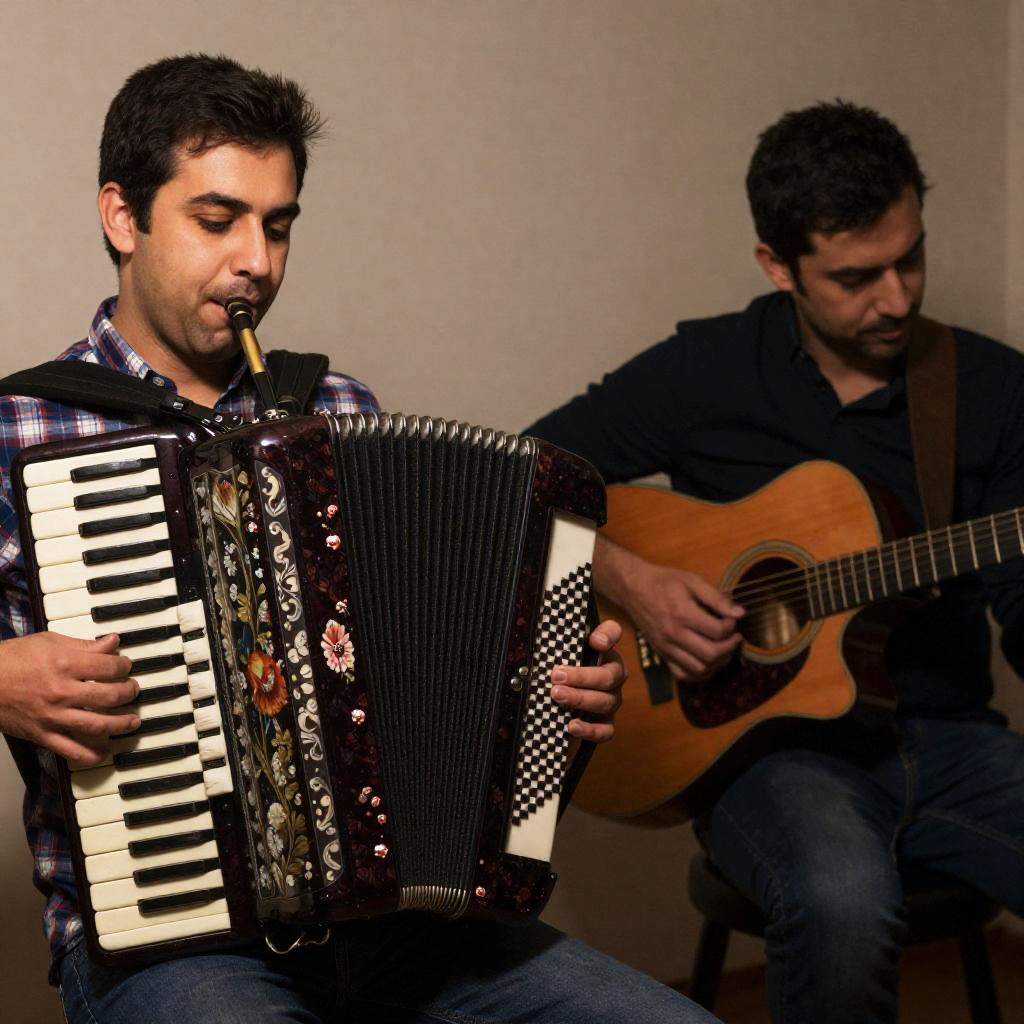 Two men playing instruments, one with a floral accordion, one with a brown acoustic guitar, in a dimly lit room. Accordion man wears plaid shirt, guitar man wears dark shirt, both focused on playing. Accordion's floral pattern visible.