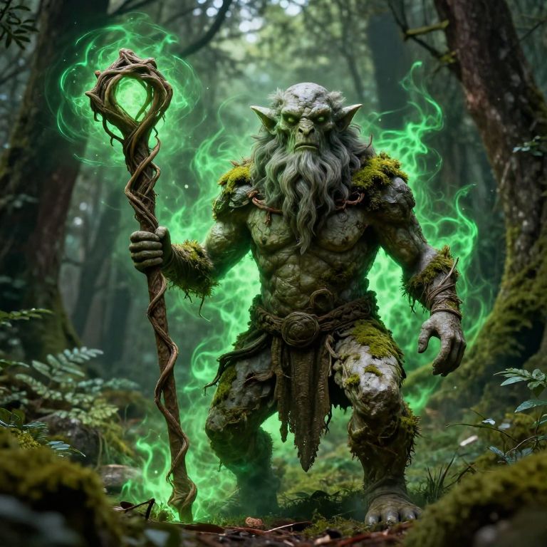Earth Genasi druid summoning a stone guardian in a wild forest, rugged earthen body textured with moss and dirt, holding a staff wrapped in roots, vibrant green magical aura enveloping them