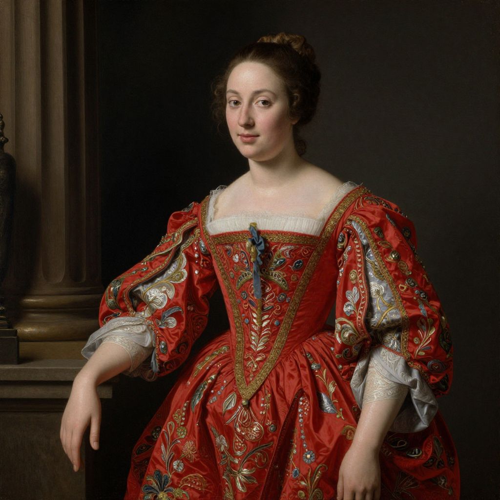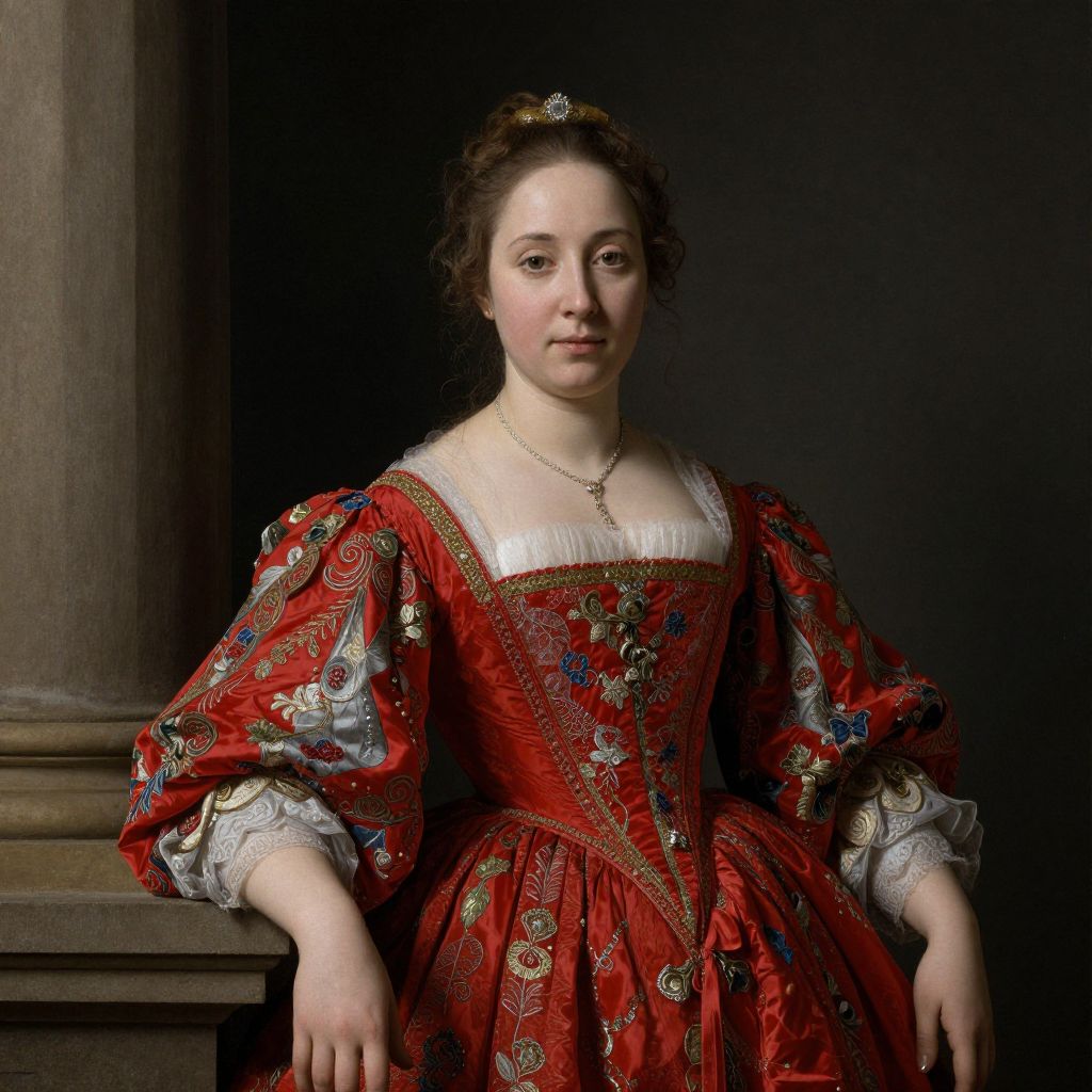 Photograph-style painting of a fair-skinned, young, Caucasian woman with brown hair in an elaborate updo, wearing an ornate red Renaissance-style gown with gold and silver embroidery, puffed sleeves, and white lace cuffs. The gown has a square neckline adorned with a blue bow. She stands against a dark, plain background with a wooden pillar on the left. Her expression is calm and composed, with a slight, closed-mouth smile. The texture of the fabric appears rich and luxurious, with detailed embroidery adding a sense of grandeur. The lighting highlights her face and dress, casting soft shadows.