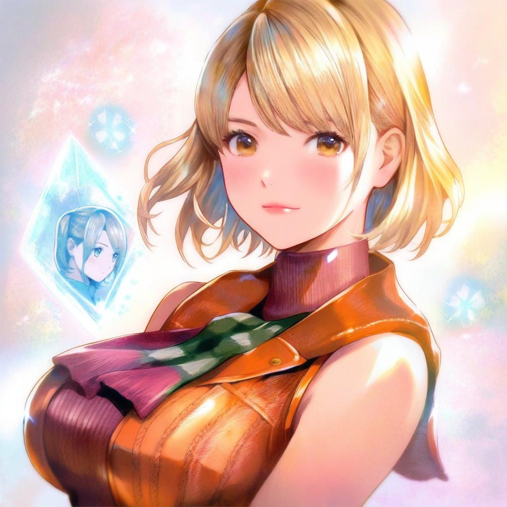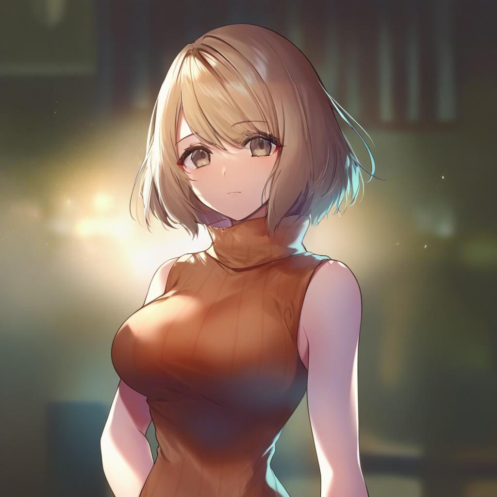 Ashley graham, resident evil, 1girl, brown eyes, blonde hair, short hair, bob cut, large breasts, sleeveless turtleneck, by artist mayo riyo, animagine