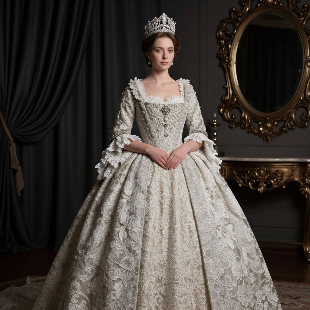 Elegant portrait of a woman adorned in a regal 1902 coronation gown, featuring intricate lace detailing, a voluminous bodice, and a sparkling tiara, set against a backdrop of dark curtains and a vintage mirror.