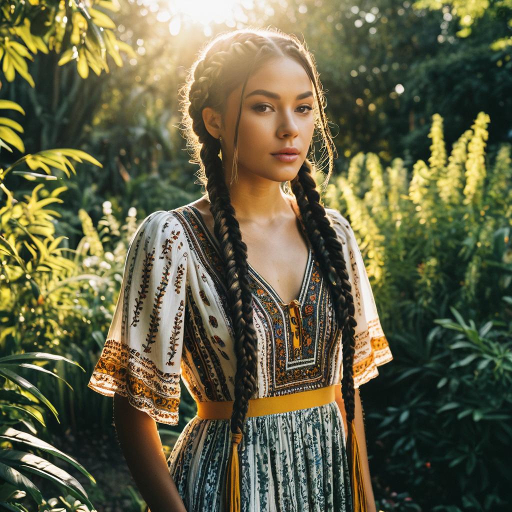 Box Braids hairstyle on female model, wearing bohemian dress, in botanical garden, captured in fashion editorial style with golden hour sunlight.