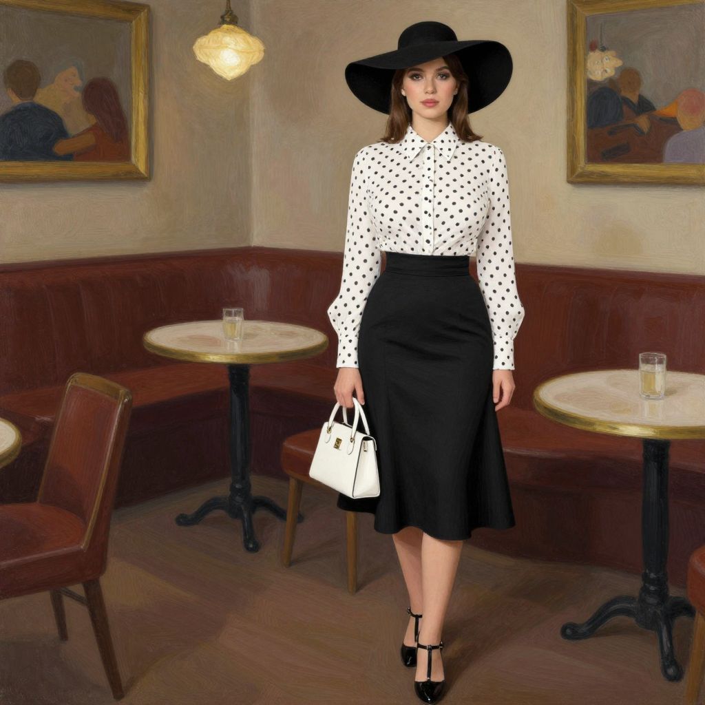 Photograph of a young woman standing in a vintage-style café. She has fair skin, dark brown hair, and wears a large black wide-brimmed hat. Her outfit includes a white long-sleeve blouse with black polka dots, a high-waisted black A-line skirt, and black high-heeled sandals. She holds a white handbag in her right hand. The café has wooden booths with red cushions, small round tables with glass tumblers, and two framed paintings on beige walls. A hanging lamp casts a warm light, enhancing the cozy ambiance. The overall style is elegant and retro.