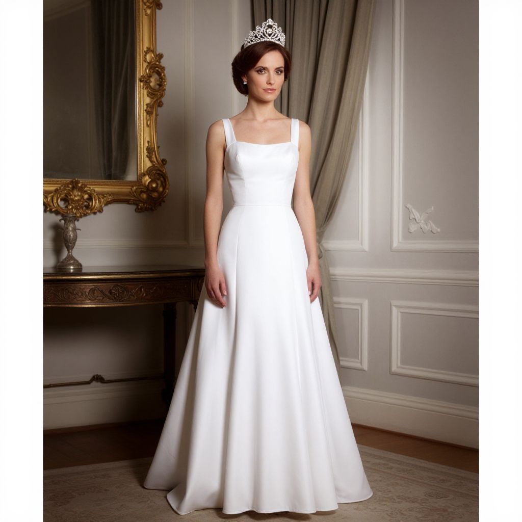 Photograph of a slender, fair-skinned woman with dark brown hair, wearing a white, sleeveless, knee-length satin wedding dress with a square neckline. She accessorizes with a silver tiara. She stands in an elegant, classical room with ornate, gold-framed mirror on a dark wooden console table to her left, and white-paneled walls with grey curtains in the background. The lighting is soft, highlighting the dress's smooth texture and the room's intricate details. The overall style is sophisticated and timeless.