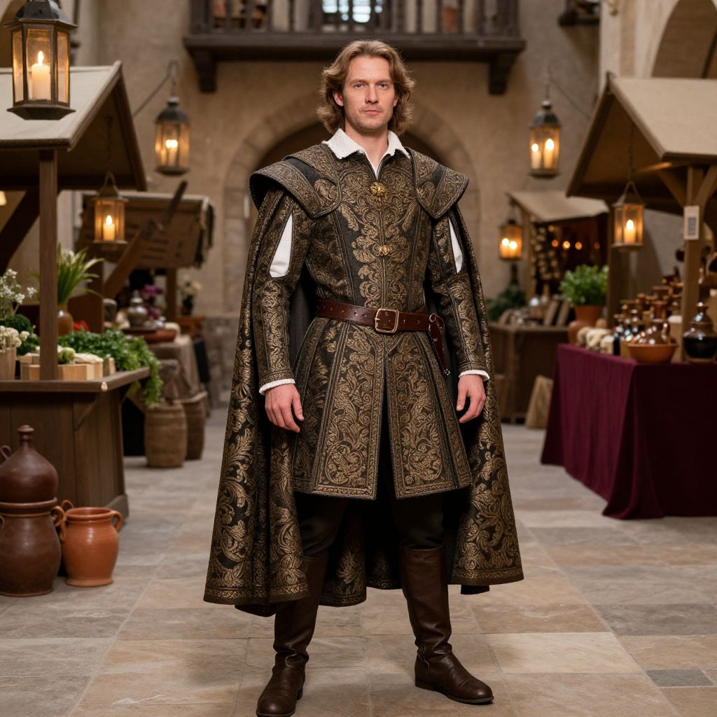 A high-resolution shot of a man in his 30s with sharp facial features, fair complexion, and sandy brown hair wearing a grand renaissance faire costume — a richly detailed doublet with elaborate embroidery, a long cloak with a brocade pattern, and leather boots — posing confidently in a historic market hall filled with candlelit lanterns and wooden stalls selling herbs and pottery.