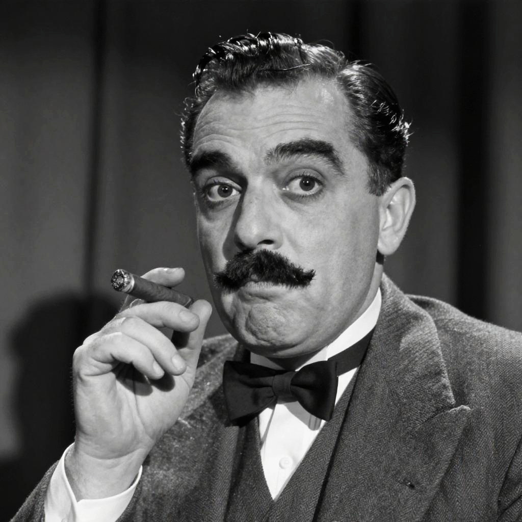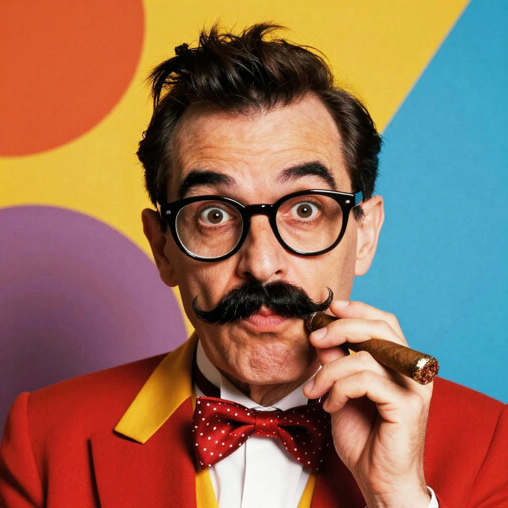Groucho Marx no mustache, cartoon caricature, bright comic book colors, exaggerated facial features, signature glasses and cigar, humorous vintage poster style