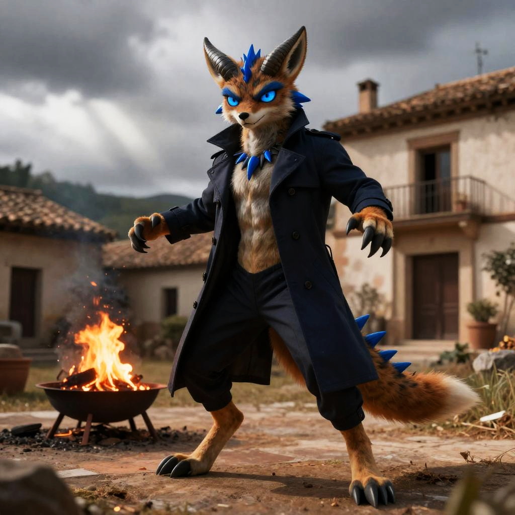Solo, male, (athletic:0.7), (slim:0.8), (lean), secret agent, jackal, (defensive action pose):1.3, (kemono:0.2), trenchcoat, ((clothed)), detailed eyes, large tail, horns, ((bust portrait)), (detailed eyes, blue eyes, glowing eyes):1.1, (outdoors:1.35), altar, village, Spain, old decrepit buildings, autumn, firepit, overcast, (grey sky), day time, sun rays, (particles, firefly, red glowing):1.3, detailed background, photorealistic, realistic hands, 8k hd, (dark shadows, wide dynamic range, hdr), by (by Pino Daeni, (by ruaidri), by virtyalfobo), (best quality, masterpiece:1), furry scalie male anthro vergence, lizard, smooth body, blue teeth, wide-eyed, (dynamic angle), blue nose horn, blue ribbed eyebrows, detailed blue eyes, blue chin spikes, chin frills, spines, blue spikes going down back of neck, (detailed pupils)