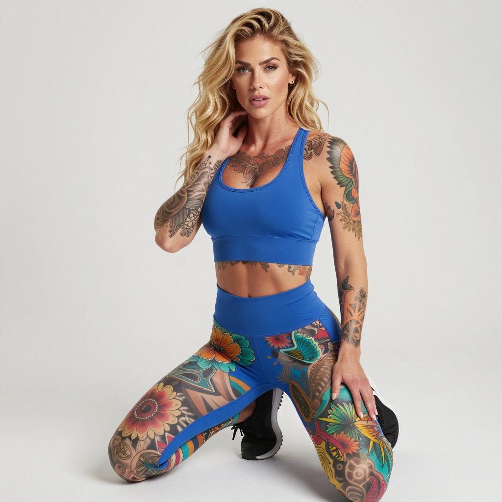 Photograph of a blonde woman with long hair, kneeling against a white background. She wears a blue sports bra and matching leggings, both covered in vibrant, colorful tattoos featuring floral and abstract designs. Her right hand touches her neck, and her left hand rests on her knee. Her expression is confident and slightly seductive.