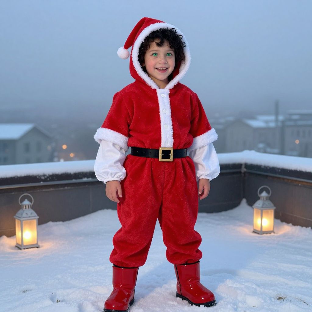 A naturalistic photo of a joyful child, around 8 years old, with freckles, curly black hair, and bright green eyes, dressed in a stylish plus-size Santa costume featuring a bright red hooded jumpsuit, white puffy sleeves, and shiny red boots, standing on a snowy rooftop during a winter dawn with fog and glowing lanterns below.
