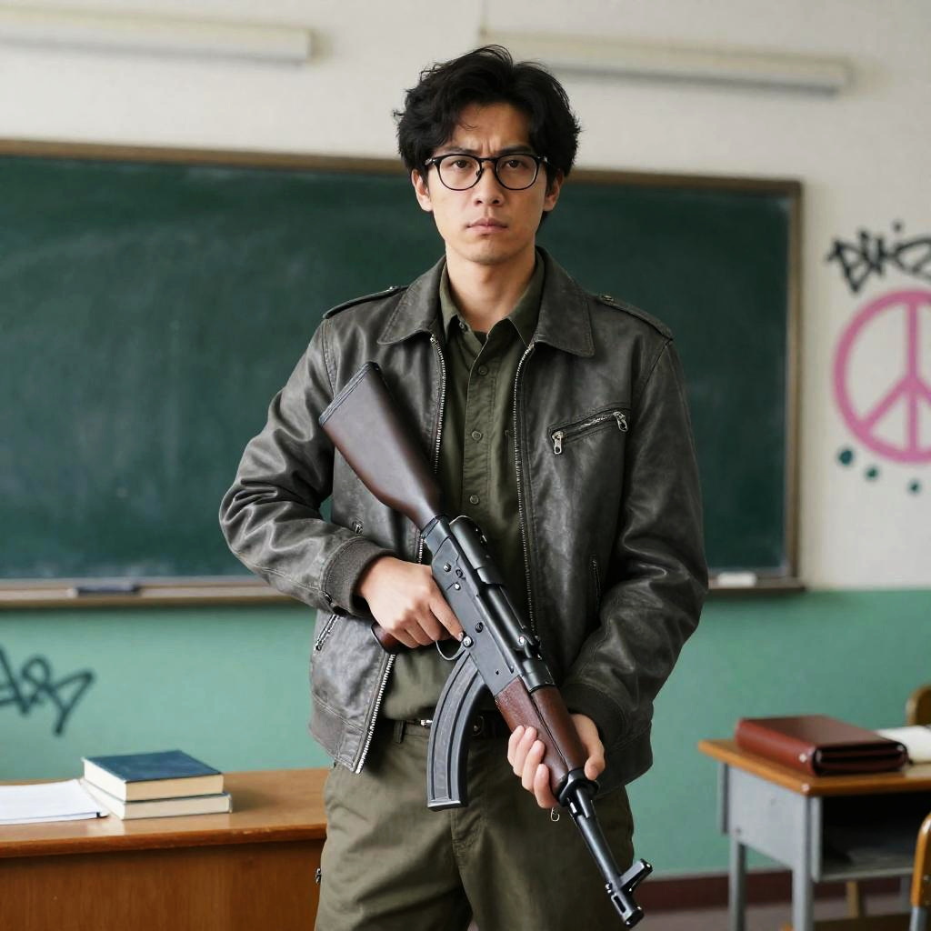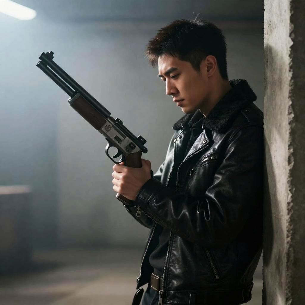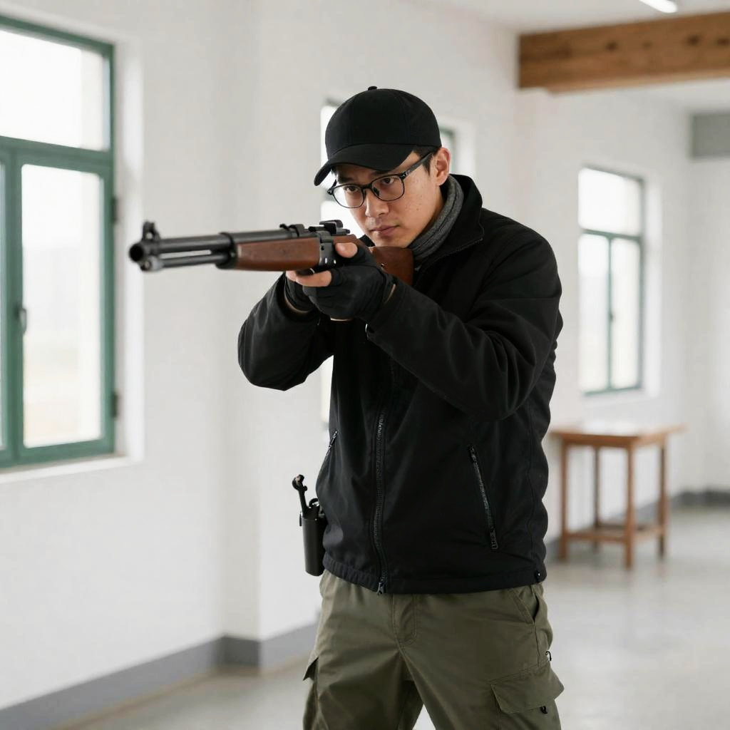 A man with a black baseball cap, glasses, and a scarf aims a rifle at the camera. He wears a black jacket, gloves, and olive pants. He stands in a white-walled room with green and white windows. He has a focused expression. The rifle is held in a two-handed stance. The background includes a wooden beam and a small table. The floor is concrete.