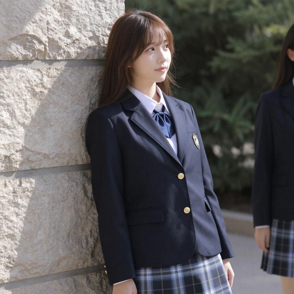 Photograph of a young woman with long brown hair, wearing a dark blue blazer with gold buttons, a blue tie, and a blue and black plaid skirt. She leans against a stone wall, looking to the right with a slight smile. Background: green foliage. Her left hand rests on the wall. Sunlight illuminates her face and hair. Another part of her plaid skirt is visible on the right.