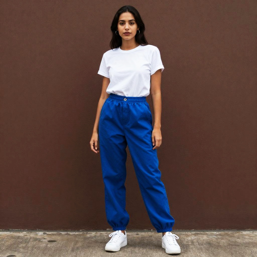 Young woman with medium skin tone and dark hair wearing a plain white short-sleeve t-shirt, royal blue high-waisted jogger pants, and white sneakers posing against a brown wall background. She accessorizes with silver hoop earrings.