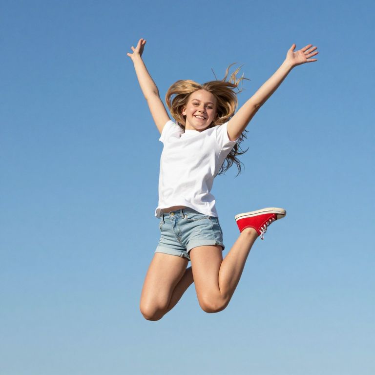 Photograph of a joyful, brown-haired woman in a colorful floral dress, mid-air leap, green grassy field background. Her arms and legs are