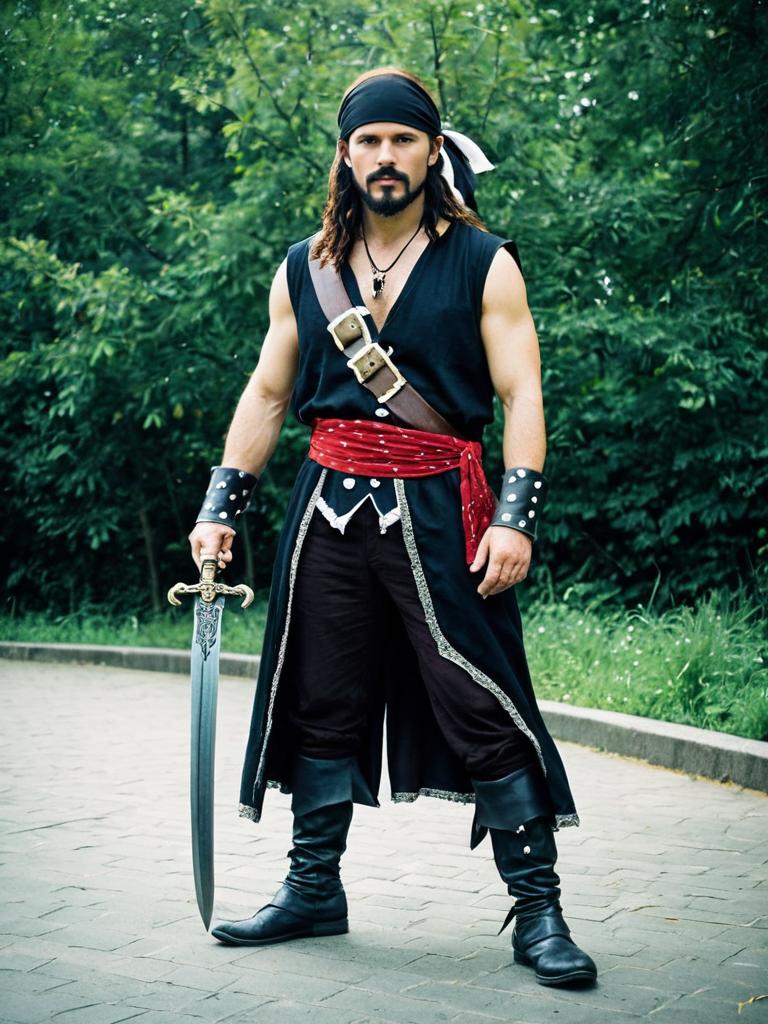 Man in Sleeveless Pirate Costume, full-body cosplay photo with sword and bandana