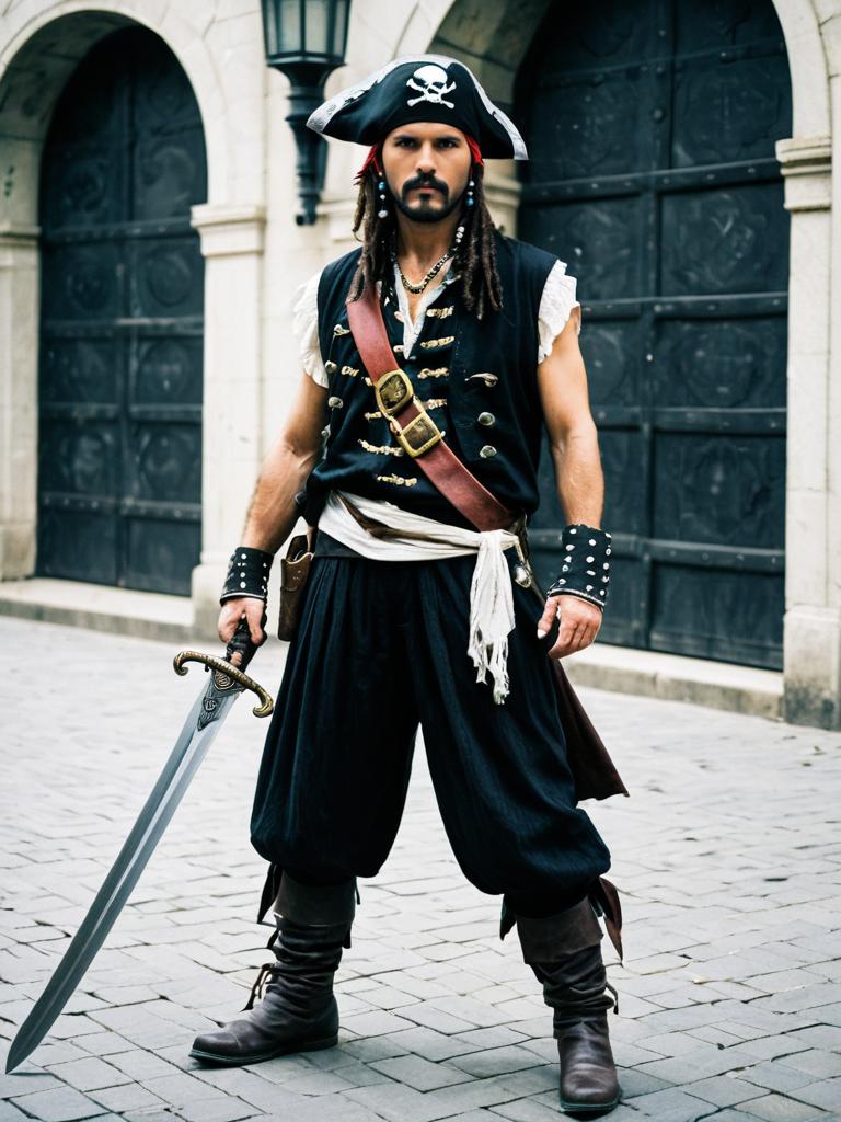 Full-body portrait of a man dressed in a sleeveless pirate costume featuring a black vest with gold buttons, a white ruffled shirt, black loose pants, and brown leather boots. He wears a black pirate hat with a skull and crossbones emblem, a red bandana, and studded wrist cuffs. The man holds a large ornate sword and stands confidently on a cobblestone street with arched doorways in the background.