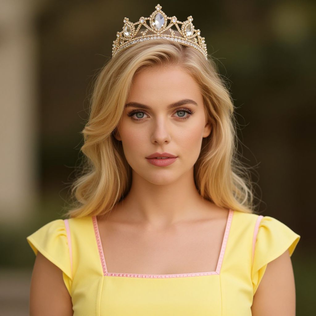 Woman with long blonde hair wearing a blue and black dress with a crown on her head.