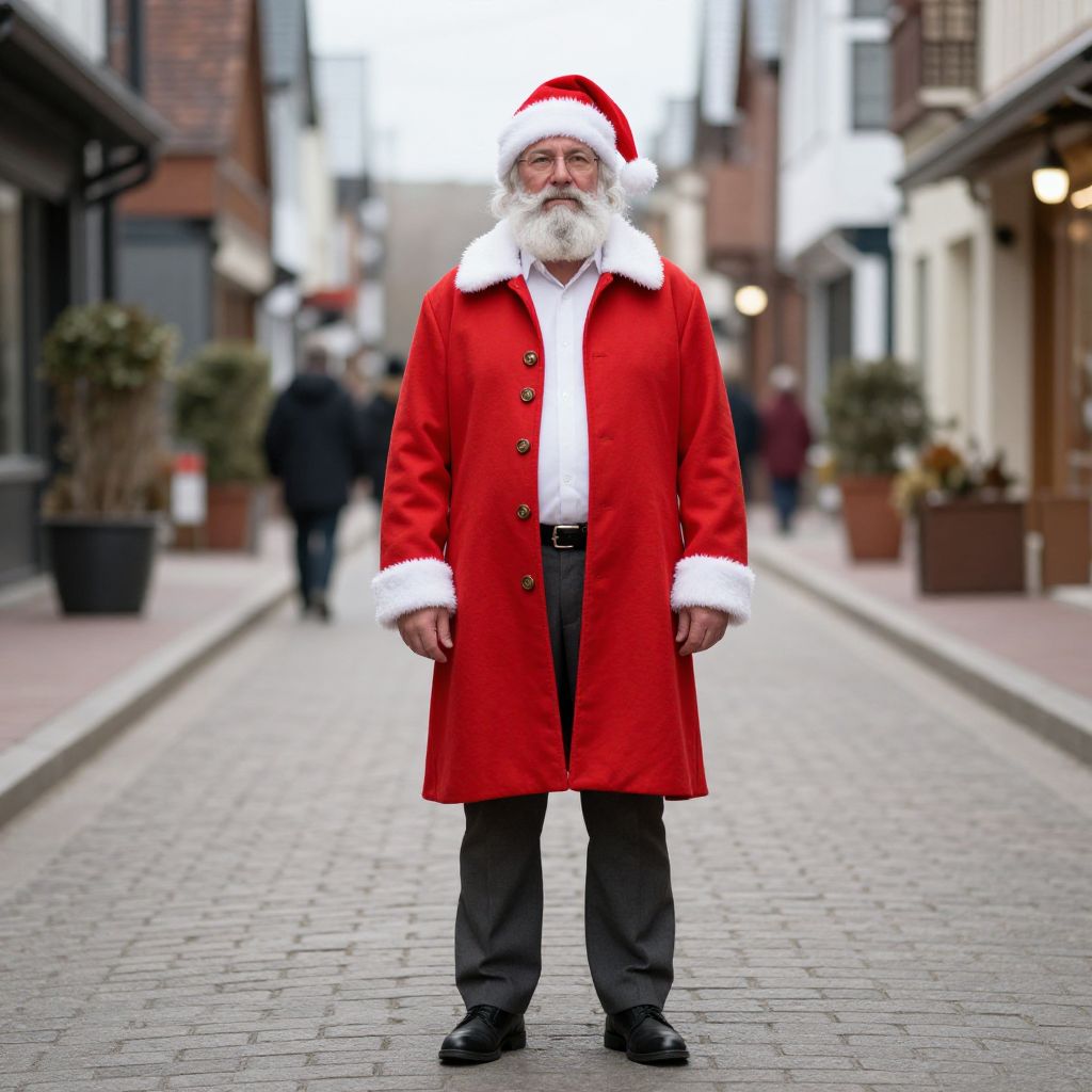 Photograph of an elderly white man with a white beard, wearing a Santa Claus hat and a bright red coat with white fur trim, standing on a cobblestone street in a European-style alley. He has black pants and black shoes, and his coat is unbuttoned, revealing a white shirt. The background is blurred, showing a few people walking, potted plants, and brick buildings. The alley is lined with soft, ambient street lights, and the overall atmosphere is festive and urban. The man stands centered, looking directly at the camera with a neutral expression.