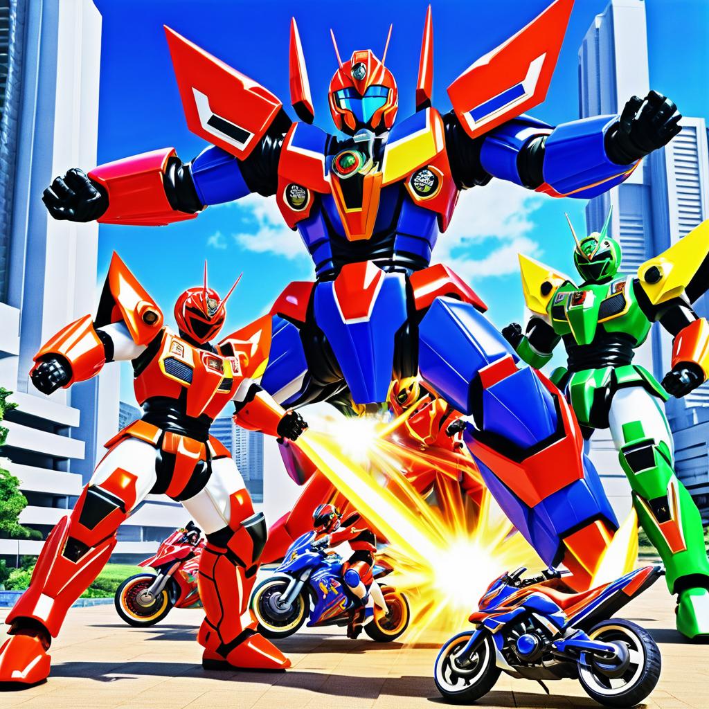 Super Sentai Kamen Rider controlling a super giant robot in vibrant tokusatsu style, with dynamic battle scene.