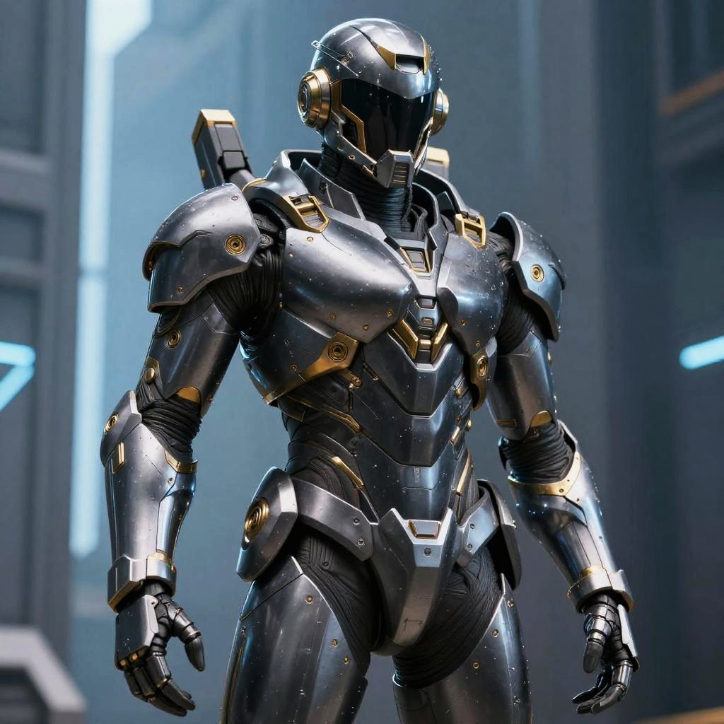 A photo of a sci-fi character in full, metallic, futuristic armor. The armor is dark gray with shiny, gold accents and intricate, angular designs. The character's helmet has a sleek, streamlined look with a black visor. The background features vertical, blue-lit panels, giving a high-tech, industrial vibe. The armor's texture is rugged and detailed, with visible seams and plates. The character stands in a strong, confident pose.