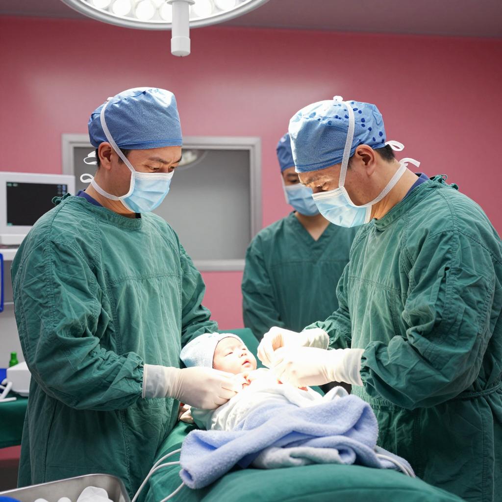 Photograph of a surgical room. Three Asian surgeons in green scrubs and caps, one holding a newborn wrapped in a blue blanket on a green surgical table. Background has red walls and frosted windows. Second surgeon to the left looks concerned. Third surgeon in background, partially obscured. Foreground surgeon gently cradles newborn's head. Visible medical equipment on left.