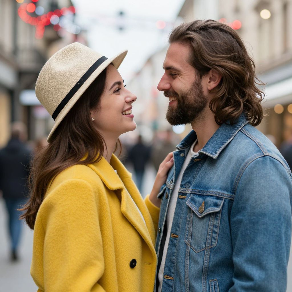 Photograph of a smiling couple in an urban setting. The woman, with long brown hair, wears a yellow coat and a beige straw hat, while the man, with a full beard and long brown hair, wears a blue denim jacket. They're facing each other closely, both laughing. The background is brightly lit with blurred red and white lights, giving a festive, lively atmosphere.