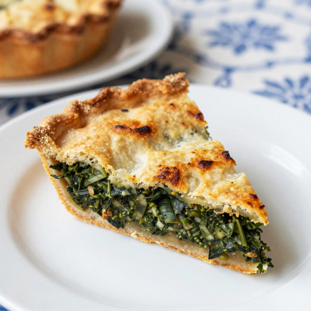 This is a close-up photograph of a slice of savory pie on a white plate. The pie has a golden-brown crust with a visible filling that looks like a mix of herbs and possibly spinach or kale, topped with a slightly burnt, crispy layer. In the blurred background, there's another pie on a similar plate. The background features a blue and white pattern, adding a touch of color contrast.